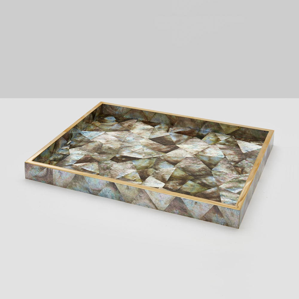Black Lip Shell surfaces are lightly lacquered for protection while preserving the organic contours and natural luster of the material. The tray base is lined with black suede, providing a soft and stable foundation suitable for styling on consoles, coffee tables, or vanities.