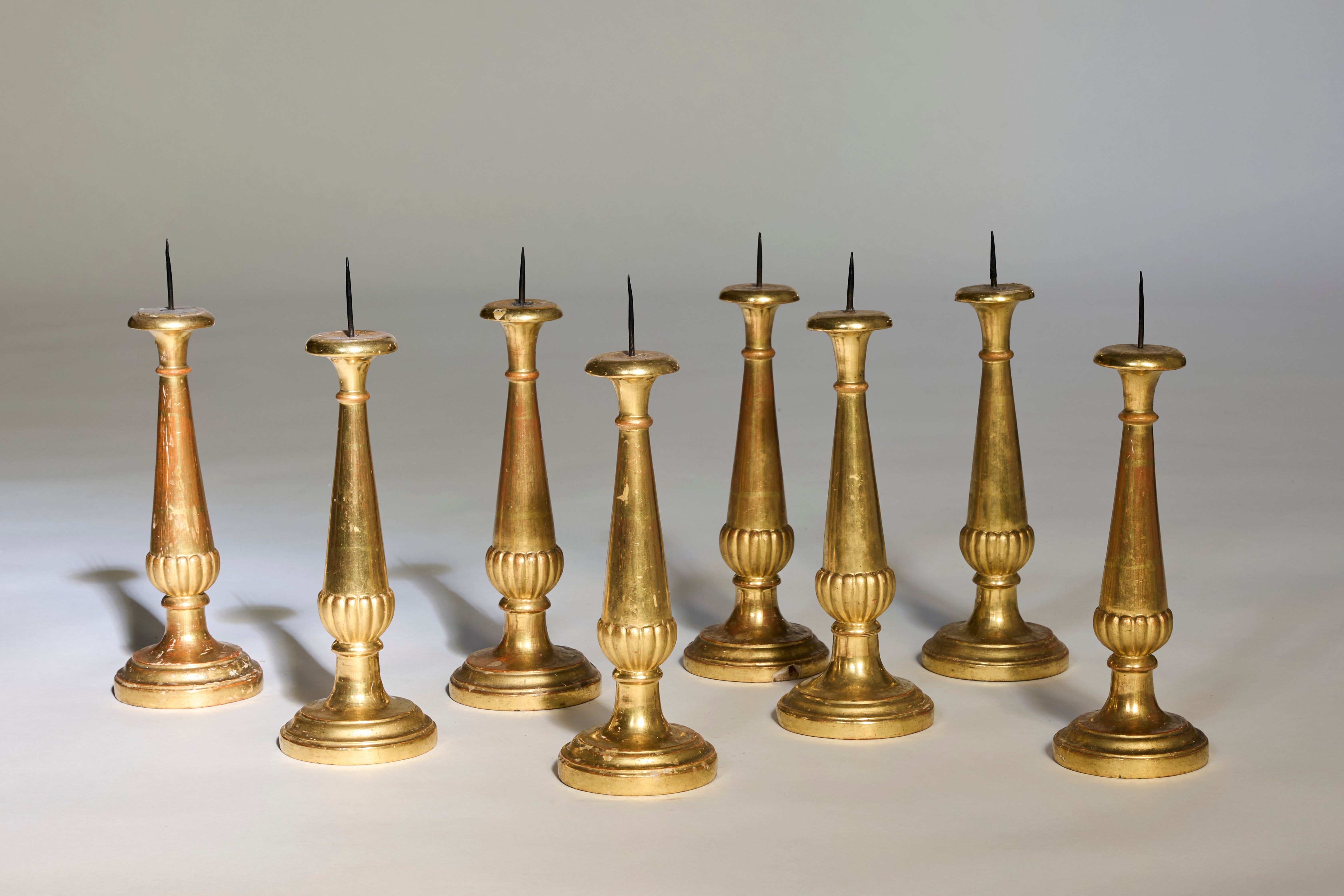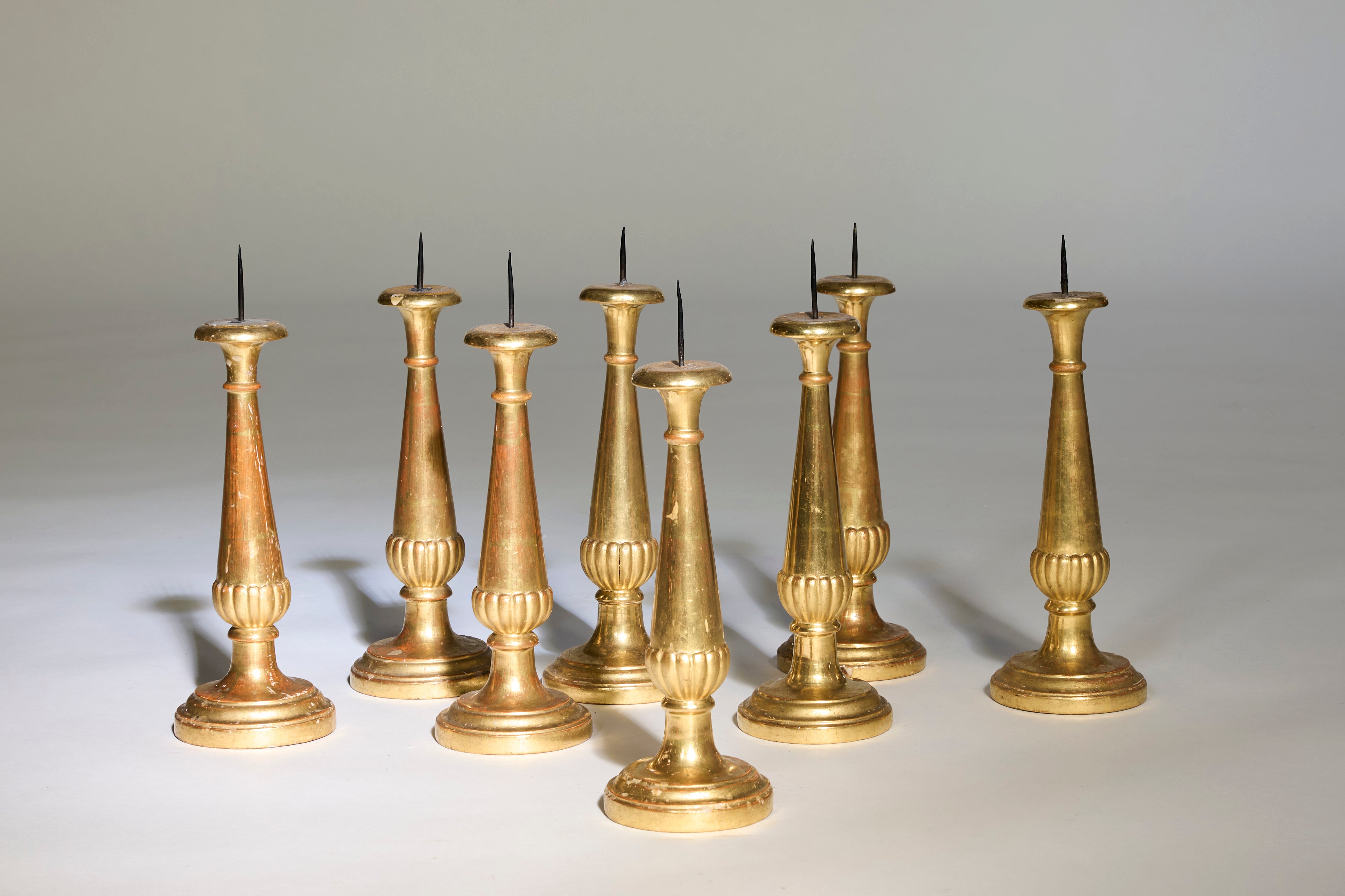 A striking set of eight antique gilt spike candlesticks, celebrated for their elegant proportions and understated classical form. Each candlestick is finely cast with a slender, tapered stem, balanced by a gently flared base and finished with a central fluted detail that adds quiet ornamentation.