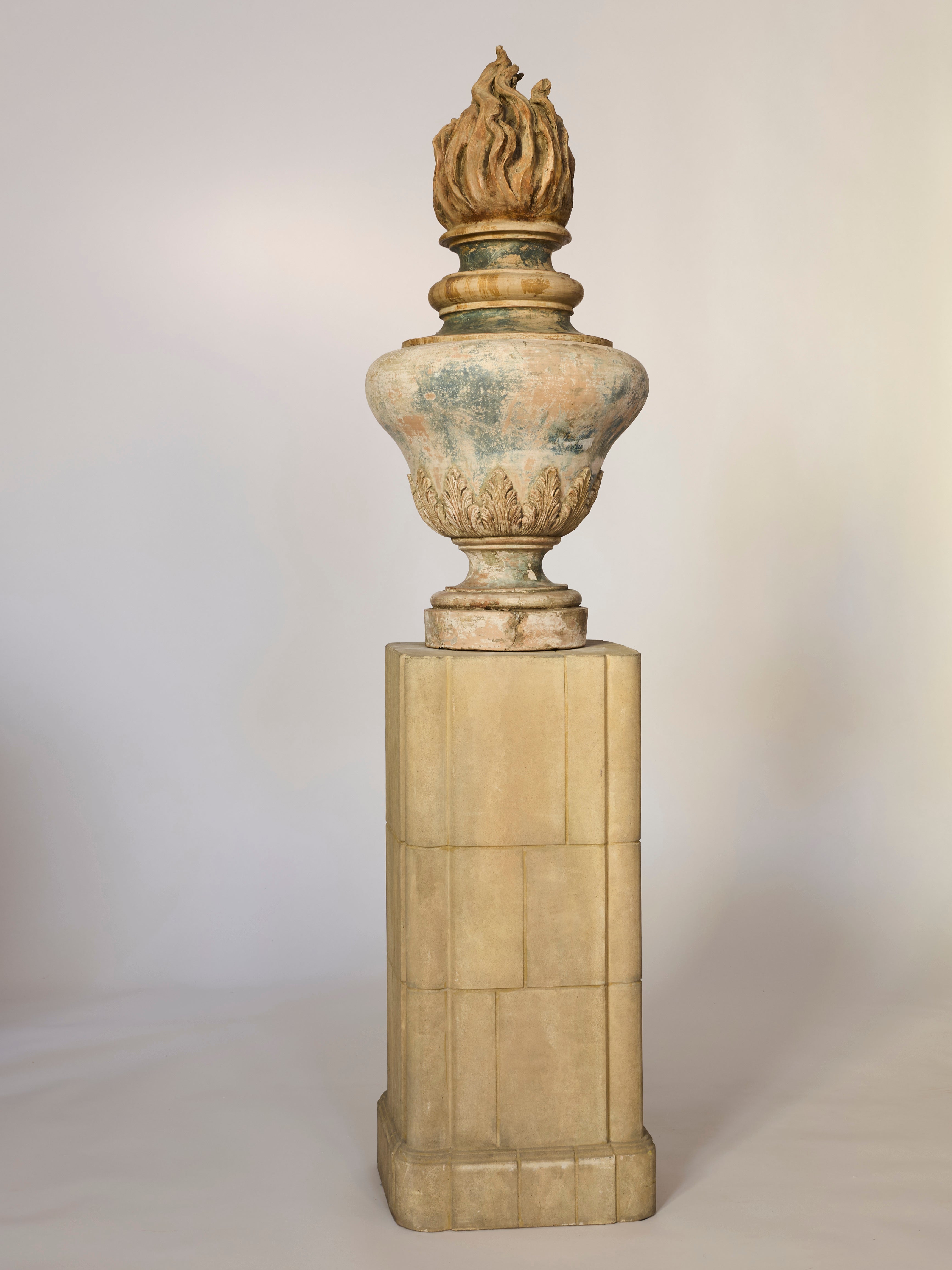 The Classical Flame Finial Urn Sculpture features carved leaf patterns, a flame finial, and weathered details that highlight its age, standing on a pedestal against a light background as an elegant decorative accent.