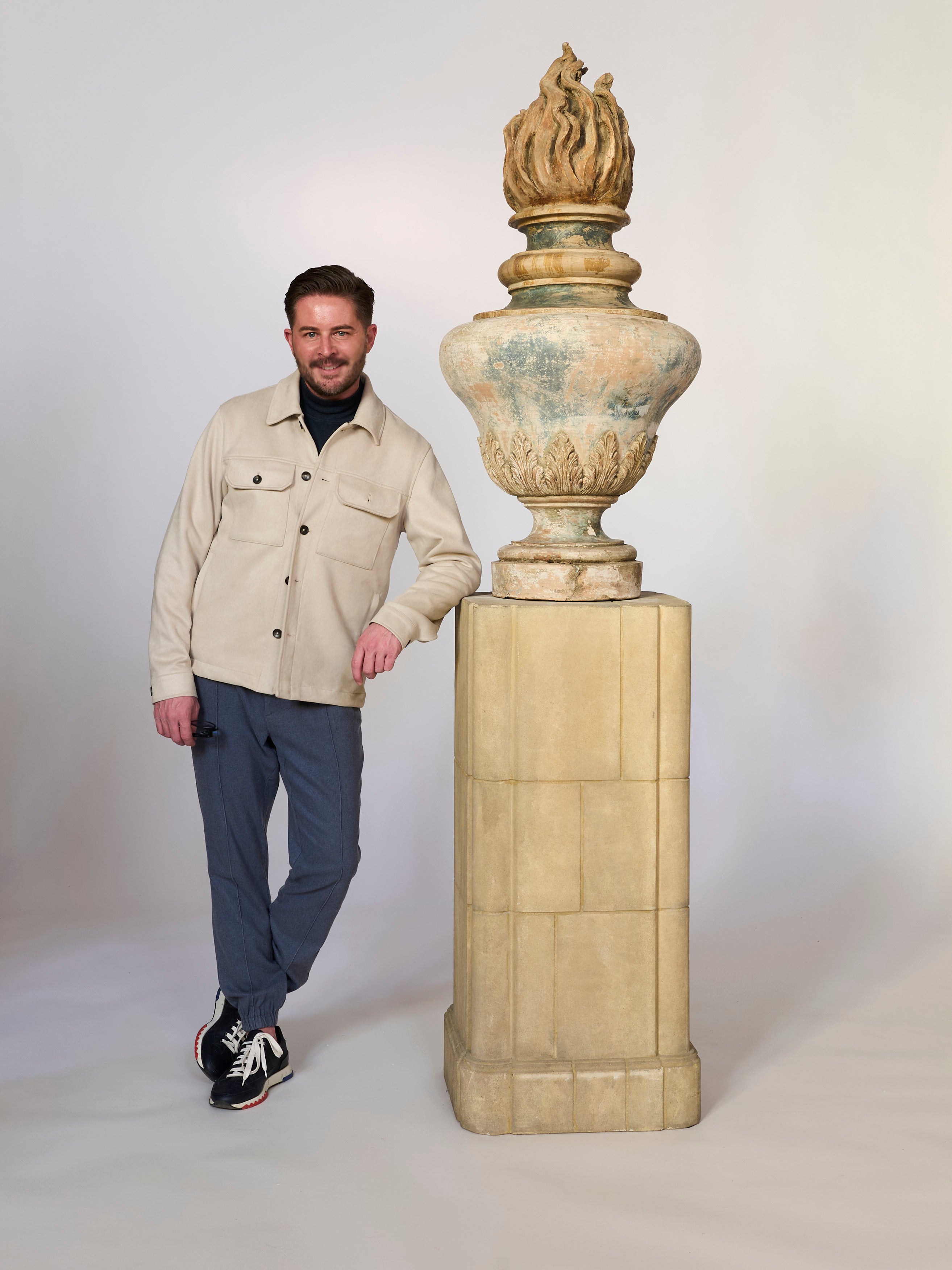 A man in a beige jacket and blue pants leans against a large stone pedestal topped with the Classical Flame Finial Urn Sculpture, posing in a studio with a neutral background.