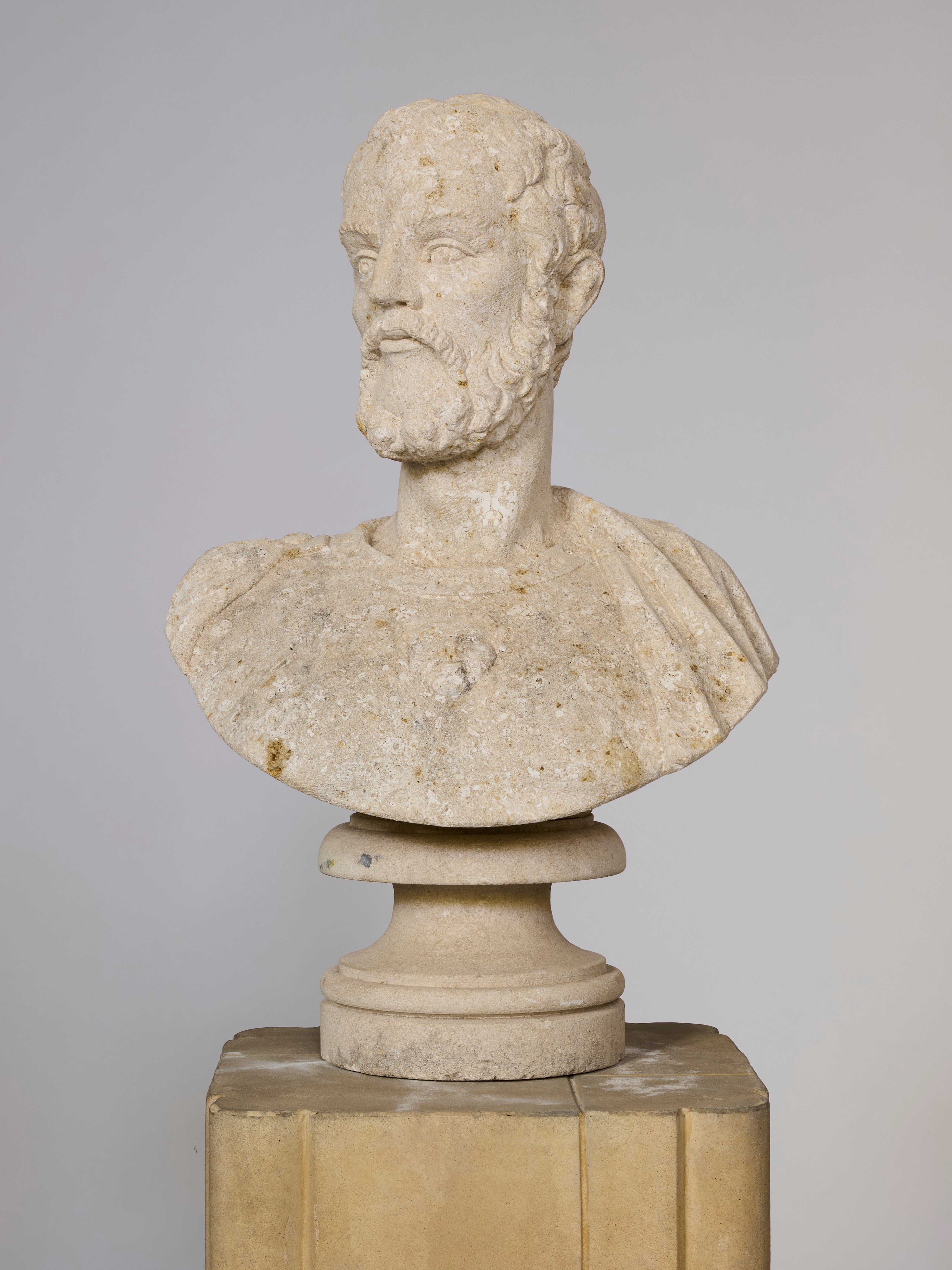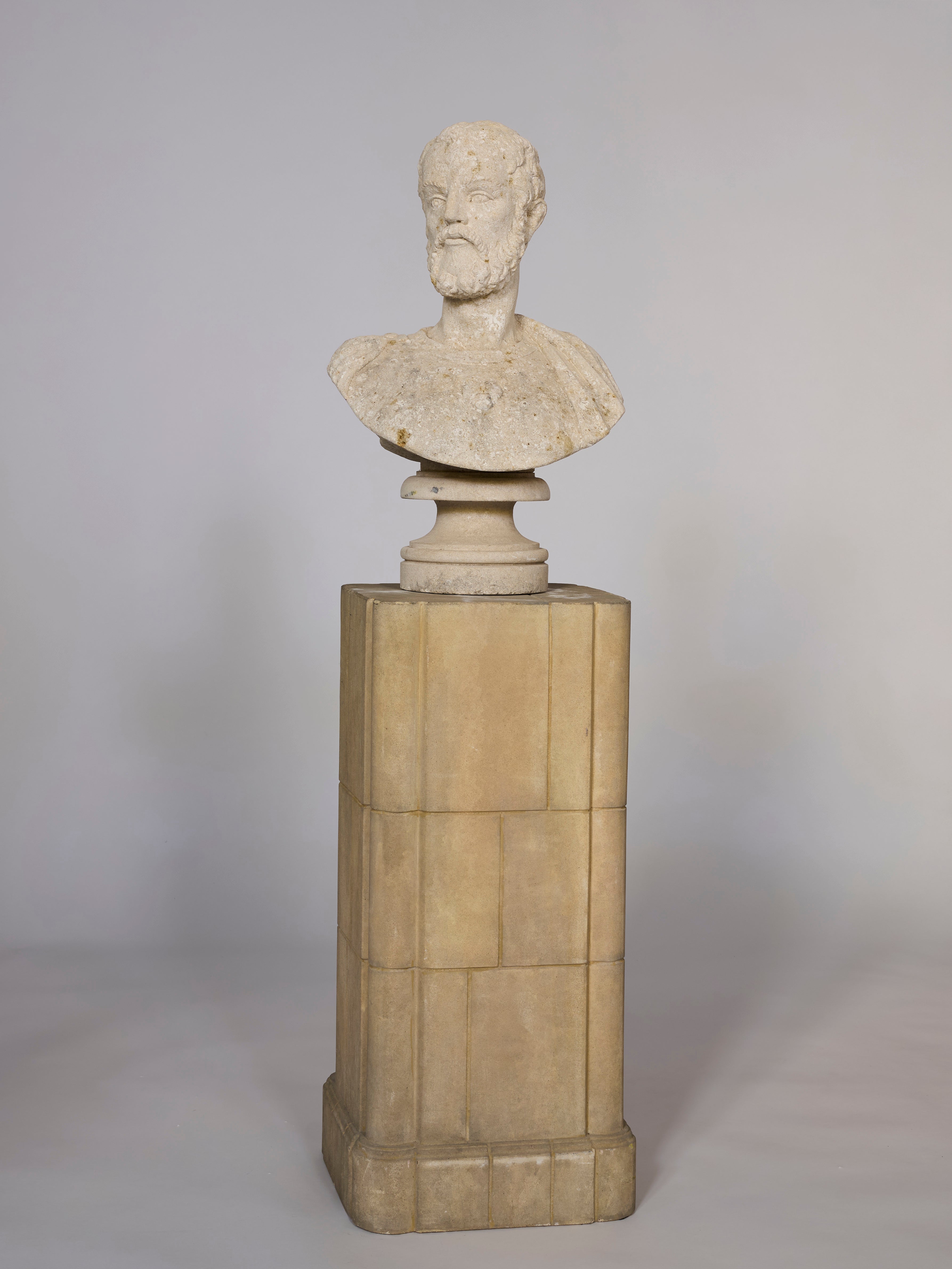 This handsome chap is resting on an integrated pedestal base, the bust carries a museum-quality presence, making it a striking focal point for interiors, entry halls, libraries, galleries, and curated residential spaces. The surface shows natural wear, texture variation, and historical aging consistent with its character and material composition, contributing to its authenticity and sculptural depth.