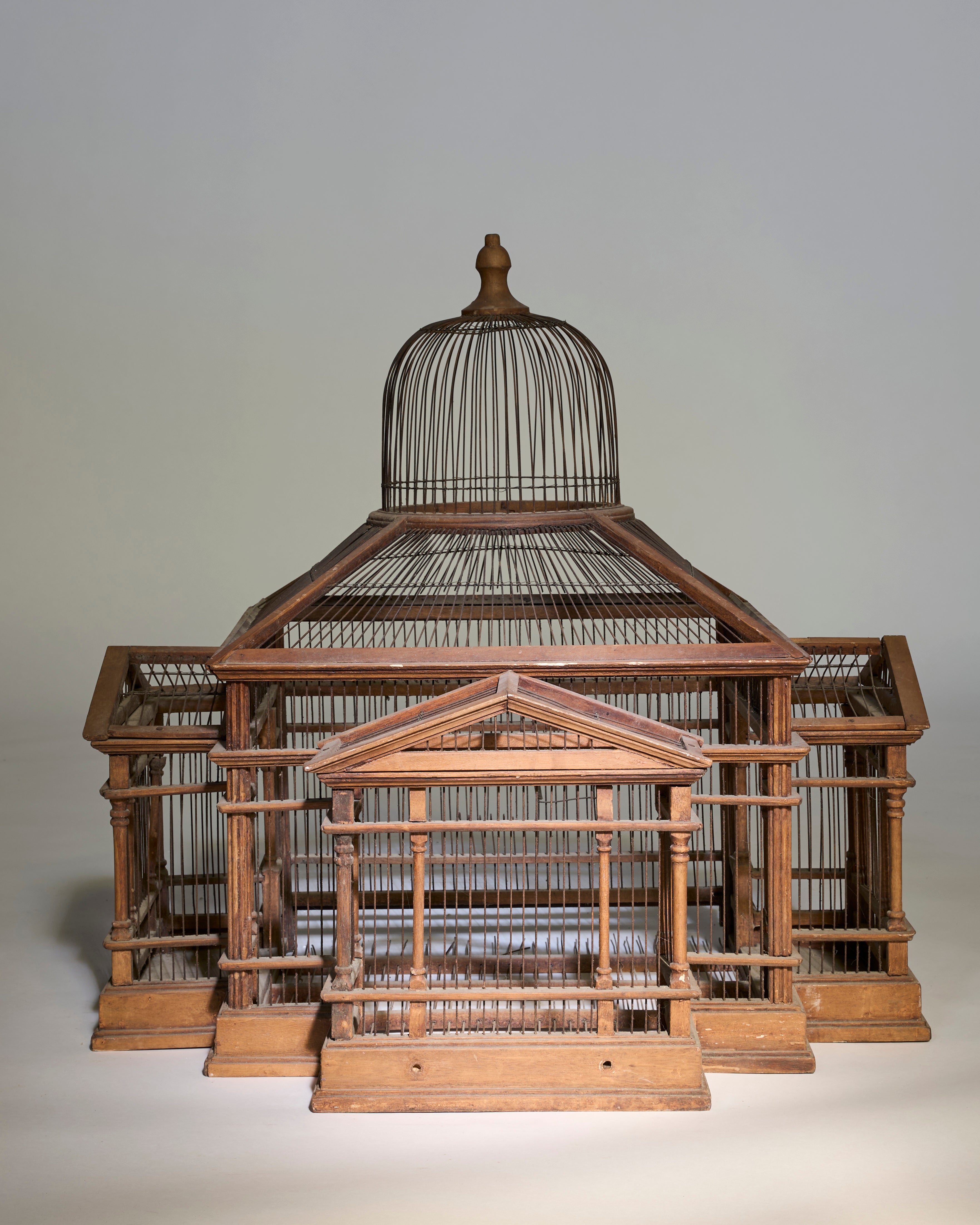 Handcrafted from warm-toned wood and finely spaced metal wire, the cage showcases meticulous detailing throughout; fluted columns, pedimented entrances, and layered platforms that lend depth and visual rhythm. The naturally aged patina, subtle wear, and tonal variations speak to its authenticity and history, enhancing its character rather than diminishing it.