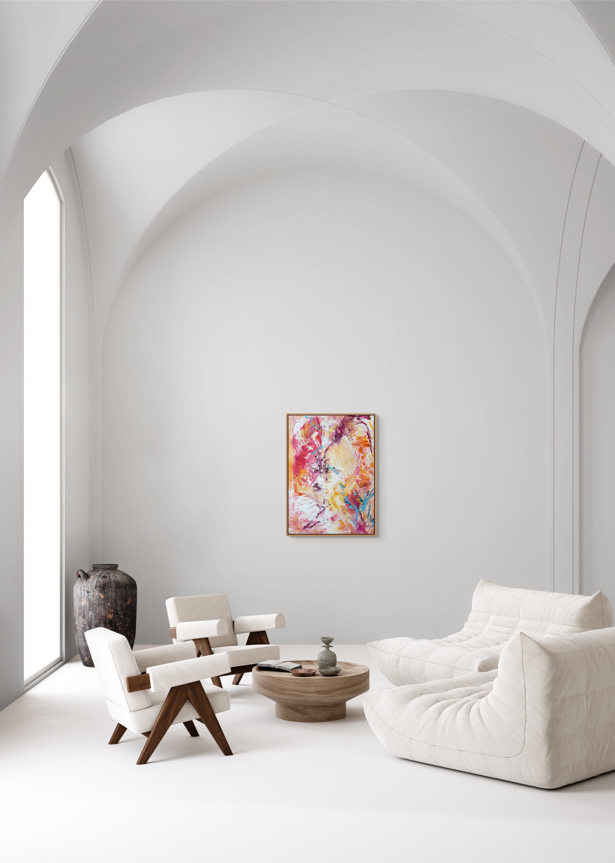 Originally from London and now based in Andalusia, her work reflects the warmth and vibrancy of her surroundings and emit a sense of quiet luxury. Mediterranean water, light and atmosphere infuse her palette — from luminous blues to sunwashed corals — creating compositions that feel both energetic and harmonious. At its heart, her practice celebrates freedom, play, and intuition — an invitation to experience colour not just as something seen, but as something felt.