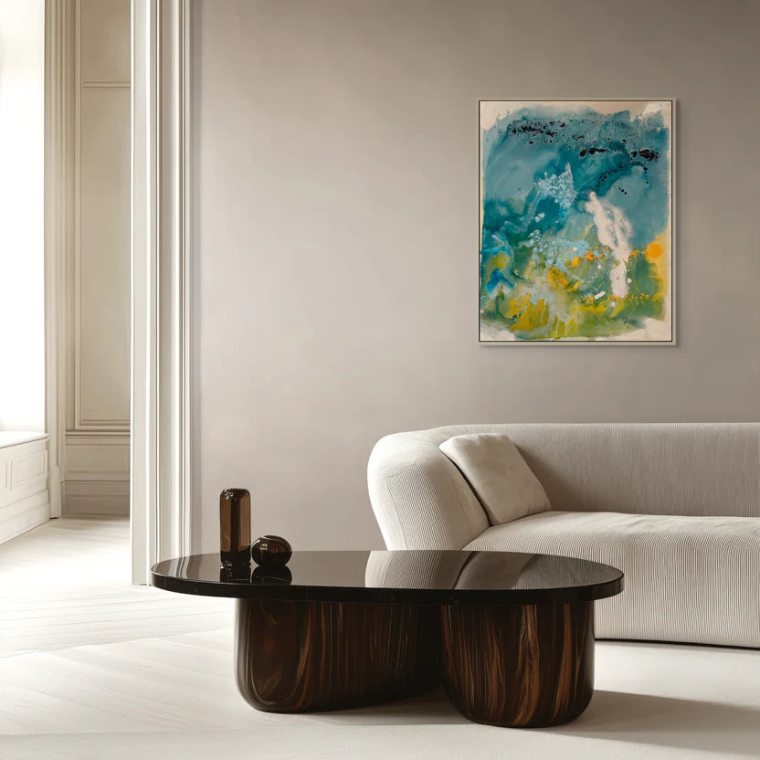 Originally from London and now based in Andalusia, her work reflects the warmth and vibrancy of her surroundings and emit a sense of quiet luxury. Mediterranean water, light and atmosphere infuse her palette — from luminous blues to sunwashed corals — creating compositions that feel both energetic and harmonious. At its heart, her practice celebrates freedom, play, and intuition — an invitation to experience colour not just as something seen, but as something felt.