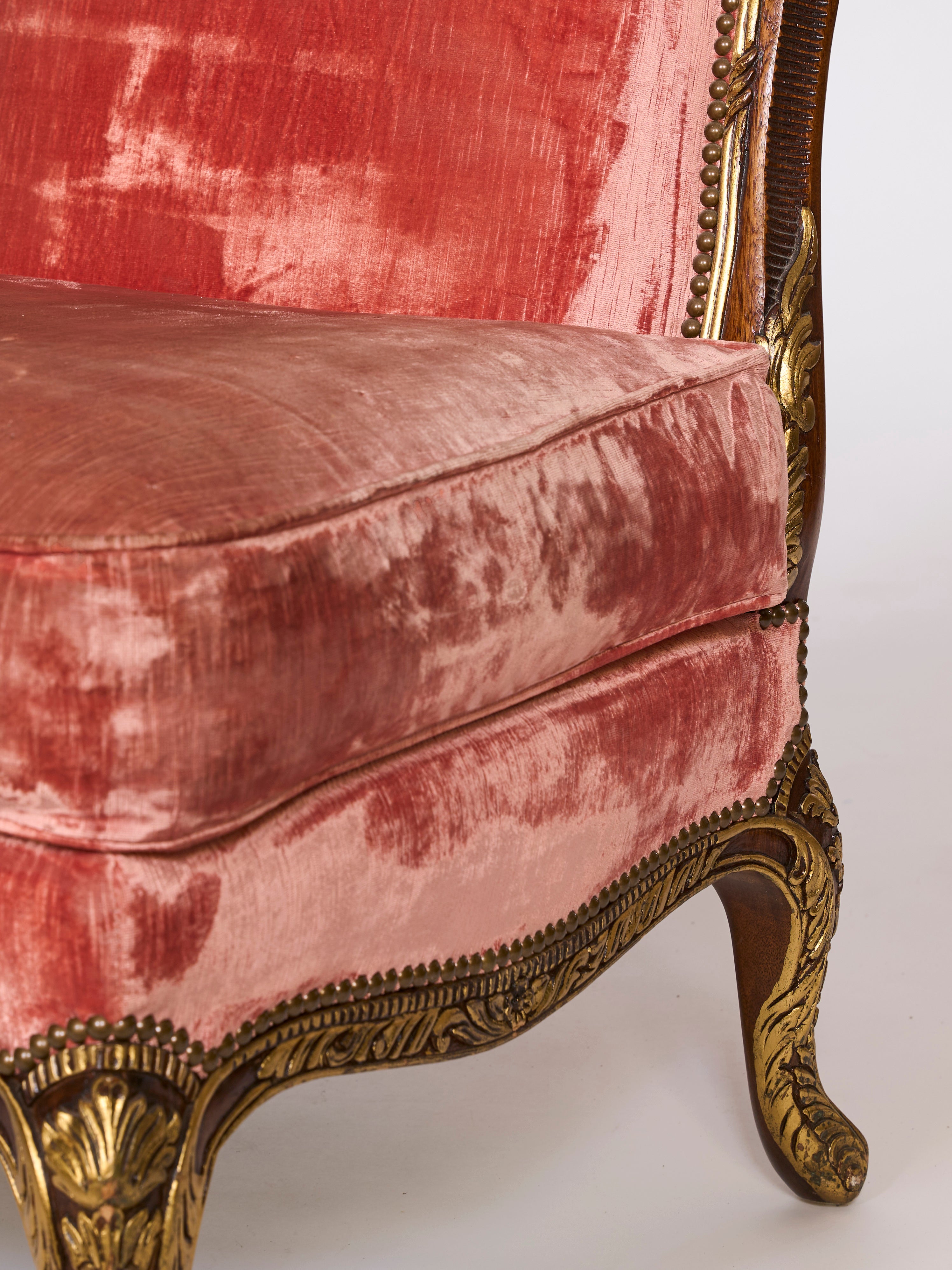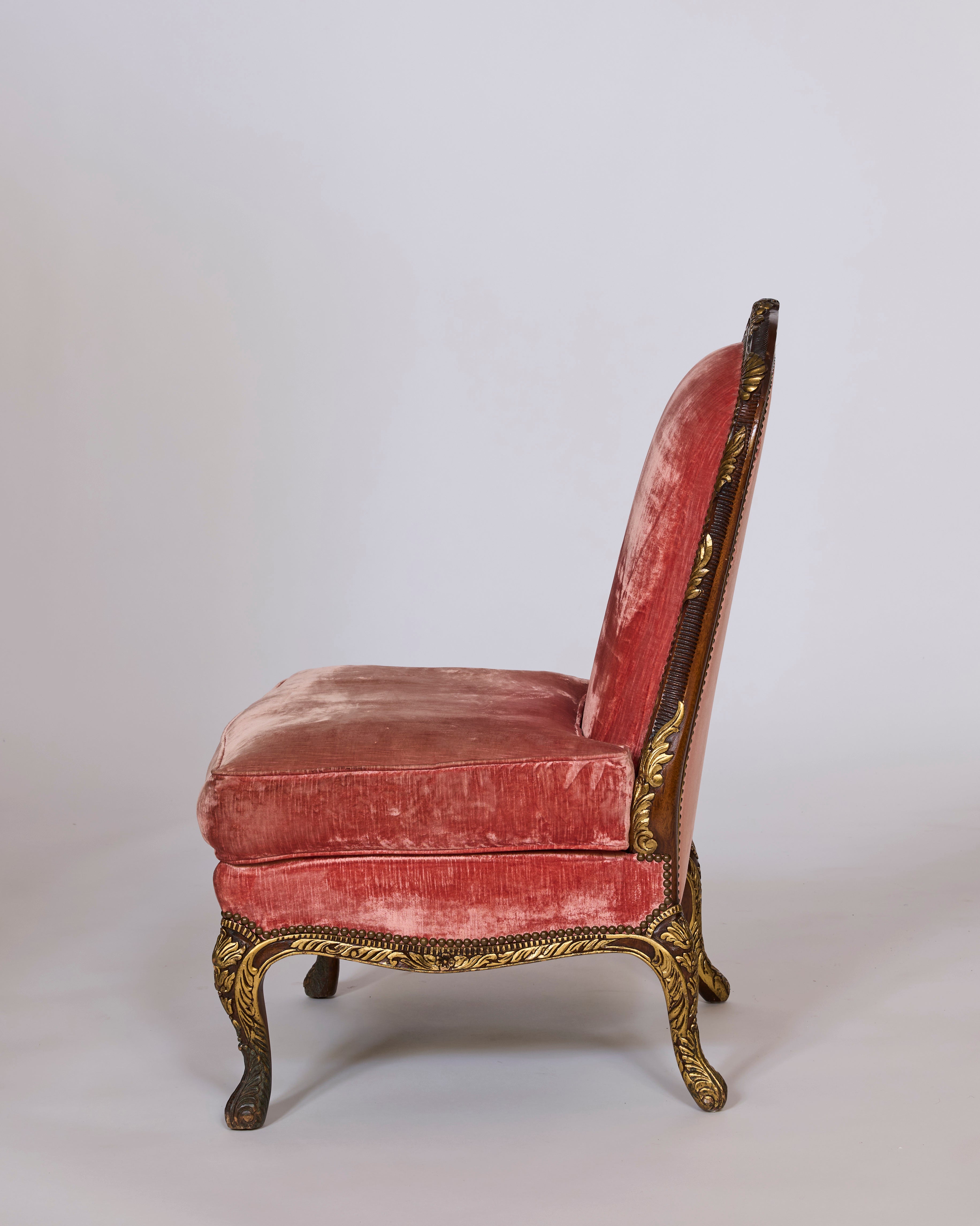 Close-up of a pair of Antique French giltwood slipper chairs featuring original rose velvet upholstery and ornate gold detailing along the edge.