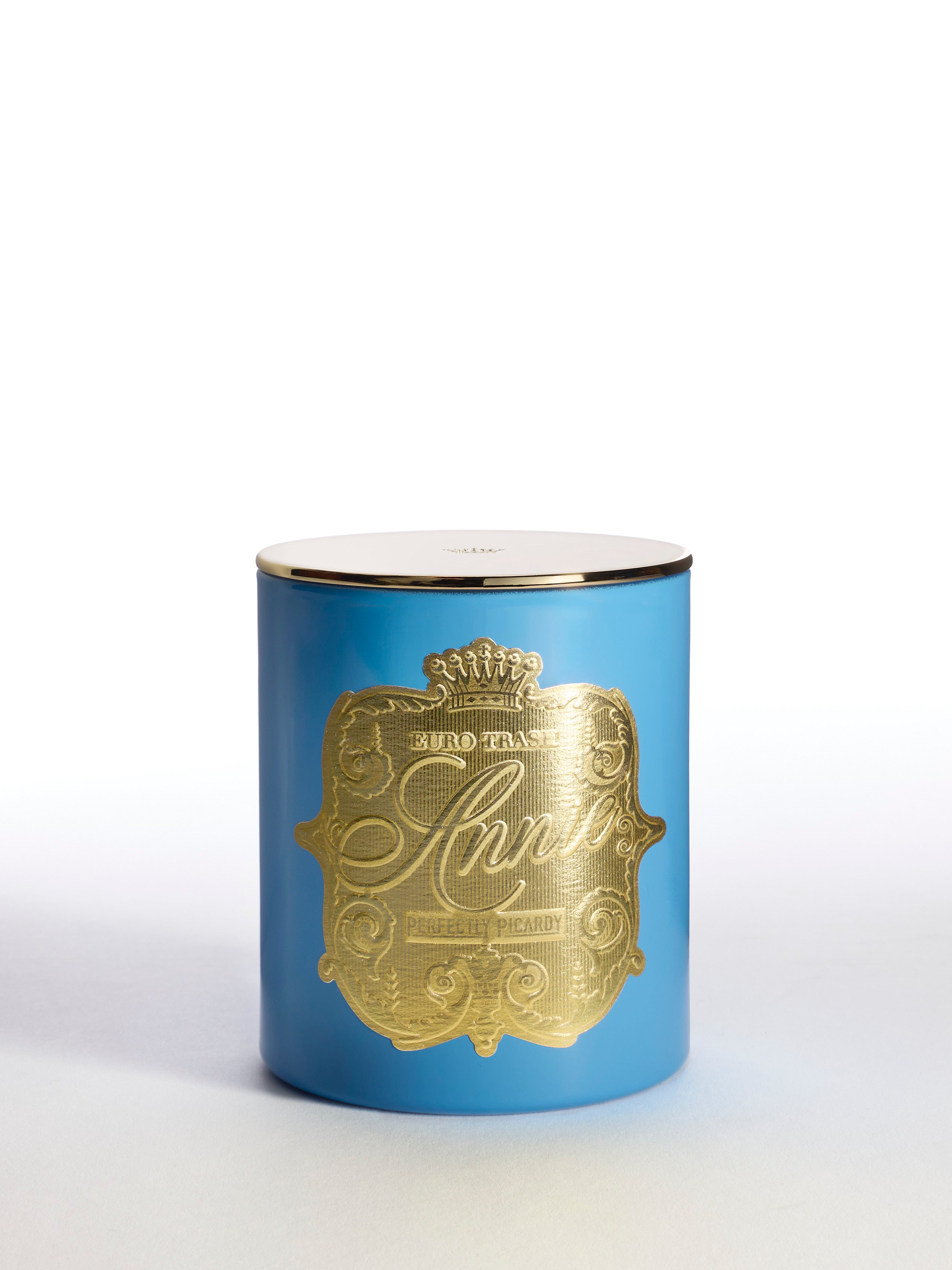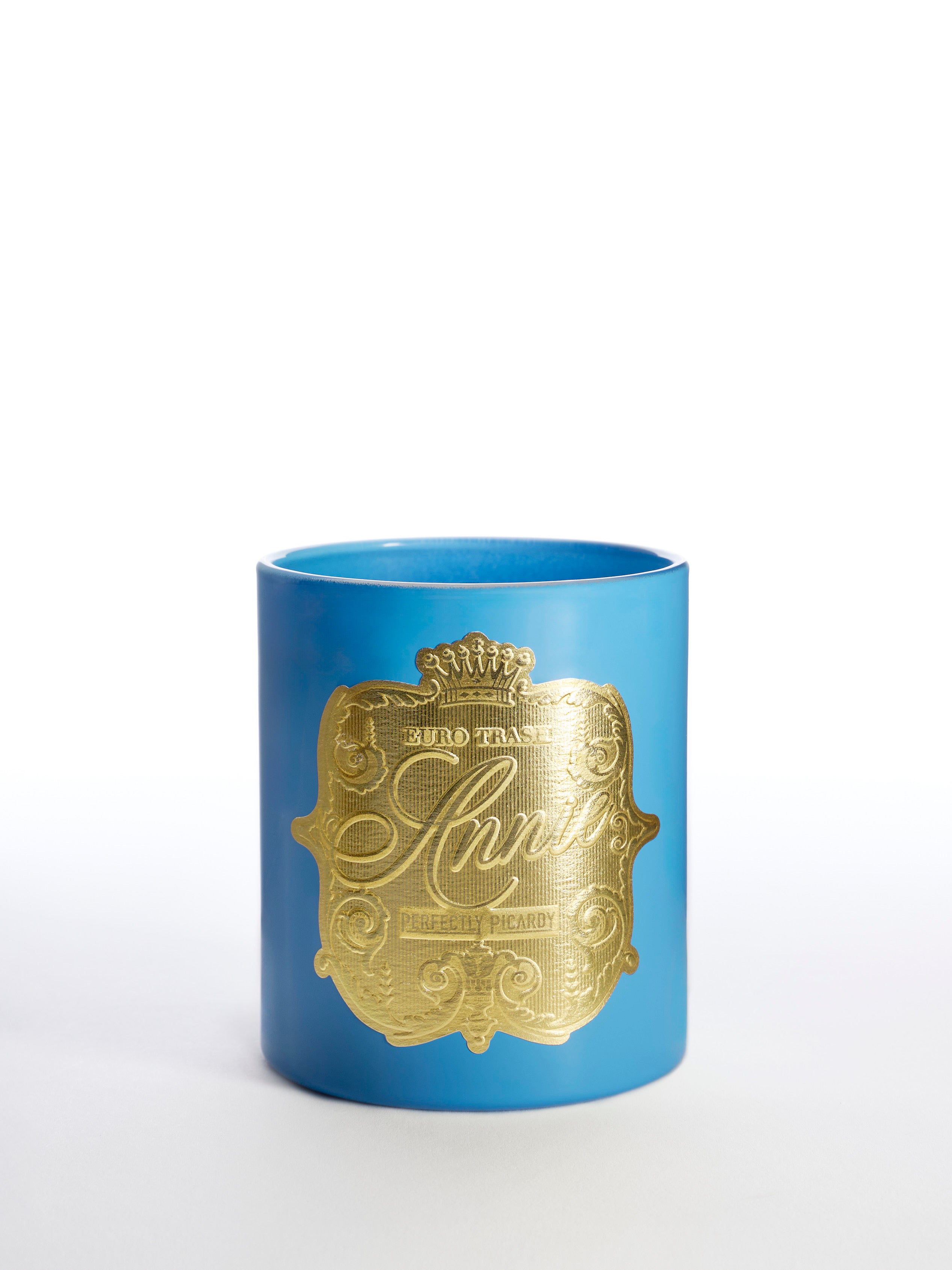The Perfectly Picardy blue scented soy candle jar features an ornate gold label with decorative text and a crown emblem. This floral, phthalate-free candle ensures an elegant, clean burn for any room. Set against a white background.