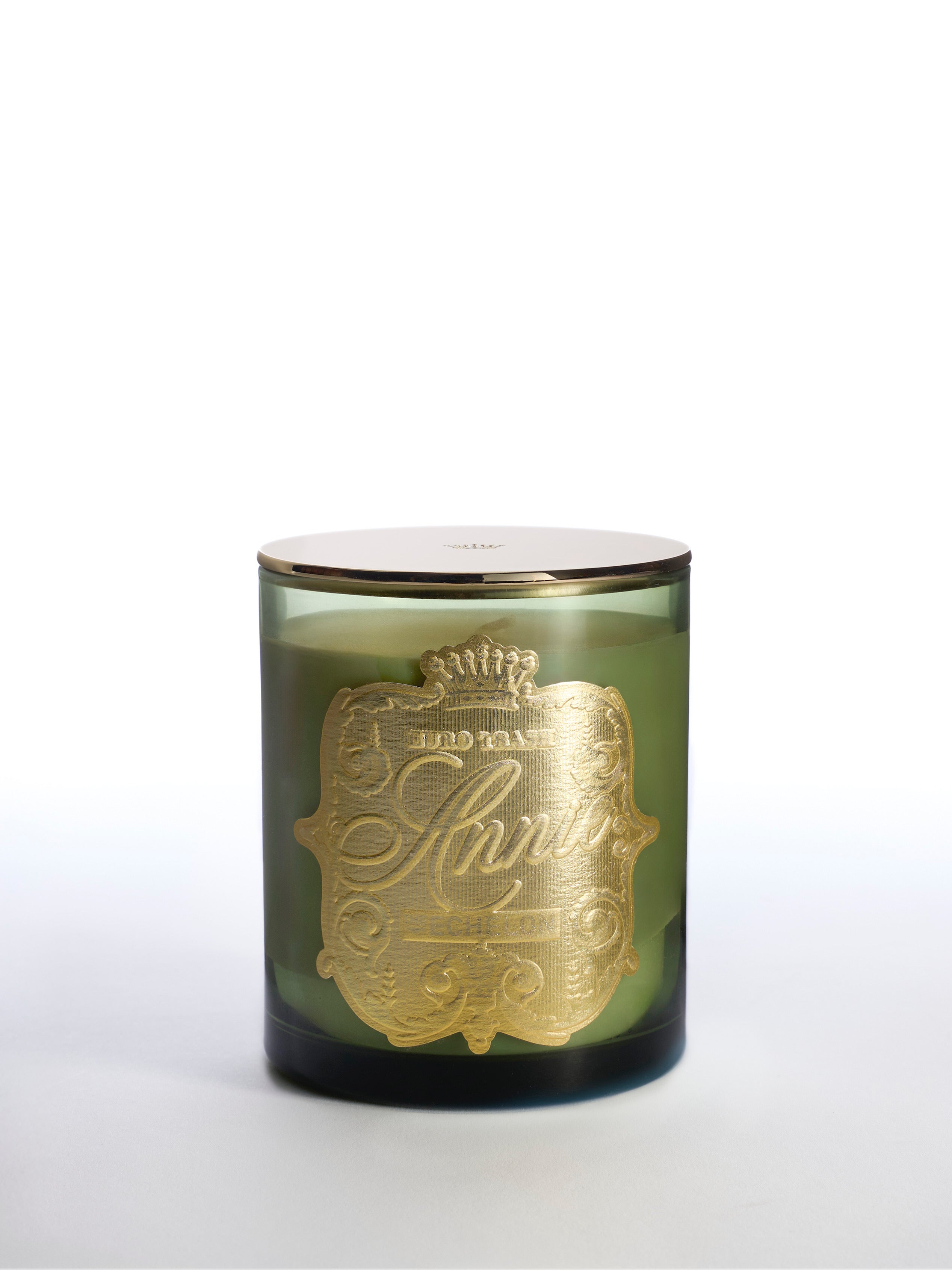 The Echelon is a green glass scented soy candle with a gold lid and an ornate gold label featuring "Année" in script, exuding warm spices, set against a plain white background.