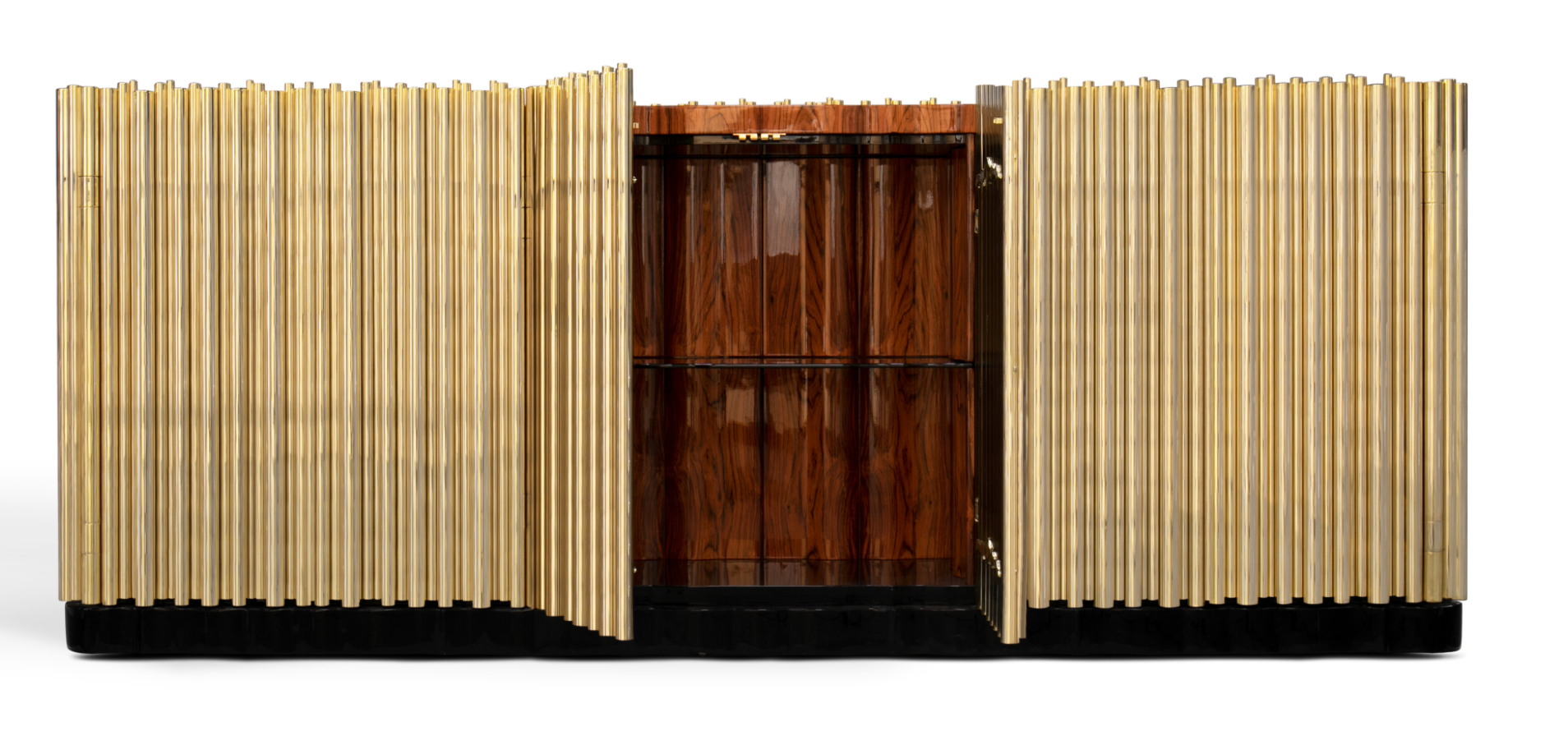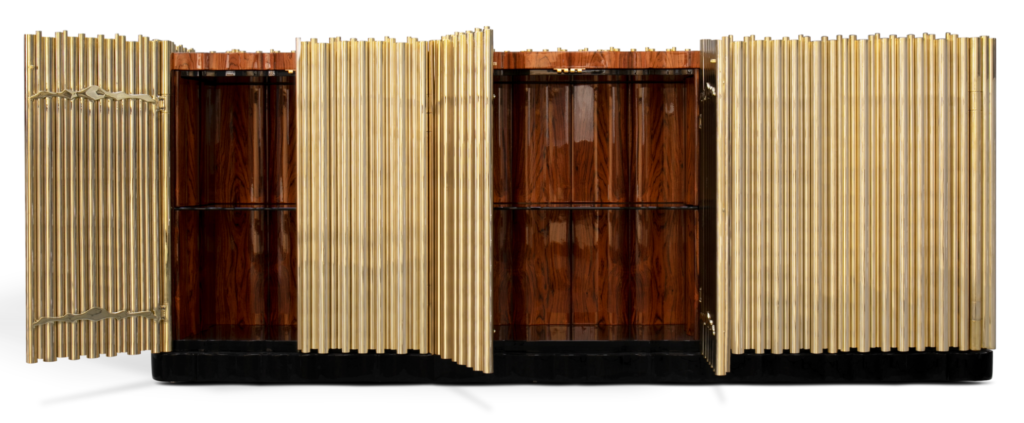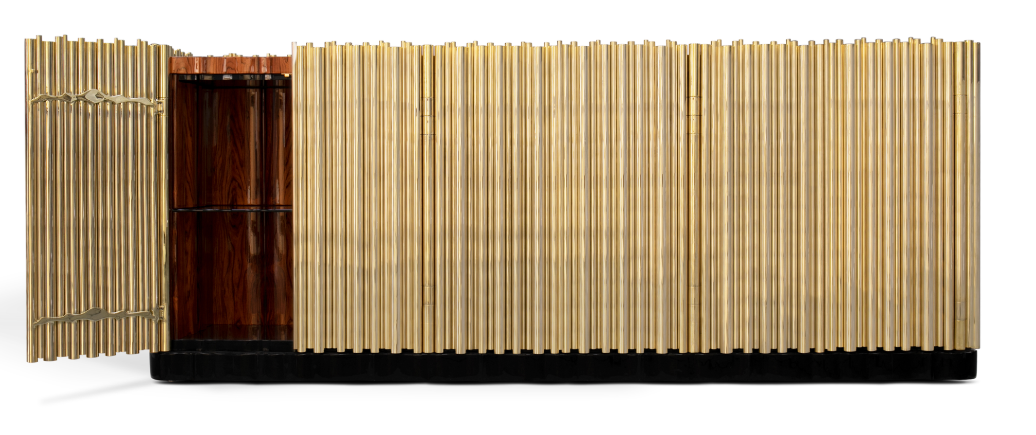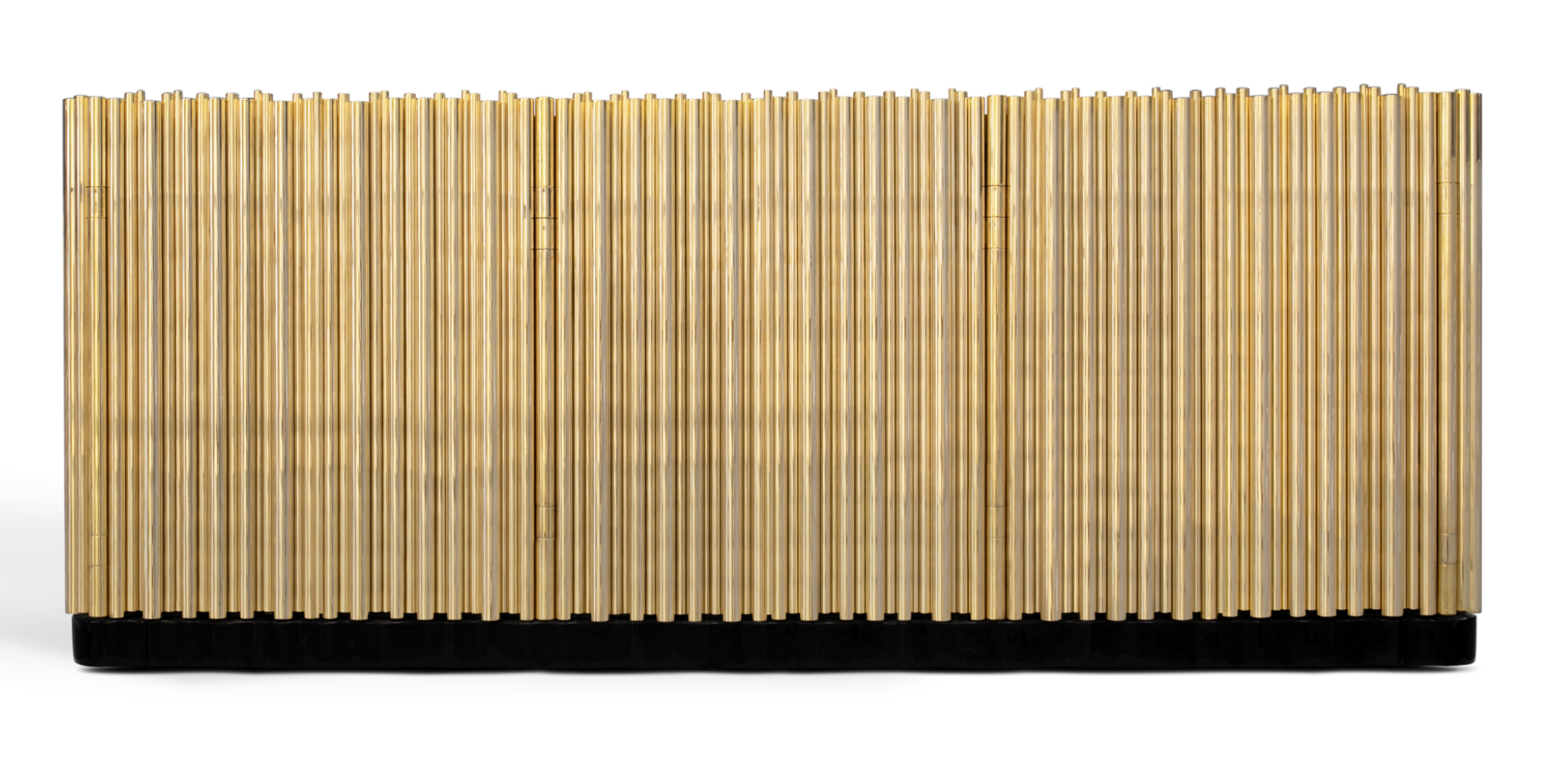 This buffet presents a strong wood body enveloped in a tubular cluster of either gold or nickel plated brass tubes, where each door is carefully welded with cutting edge-technology. A harmonious artful juxtaposition that adds rhythm and sophistication to any space. Symphony is wrapped up by a strong black lacquered base, while the top is finished in opaque black glass.