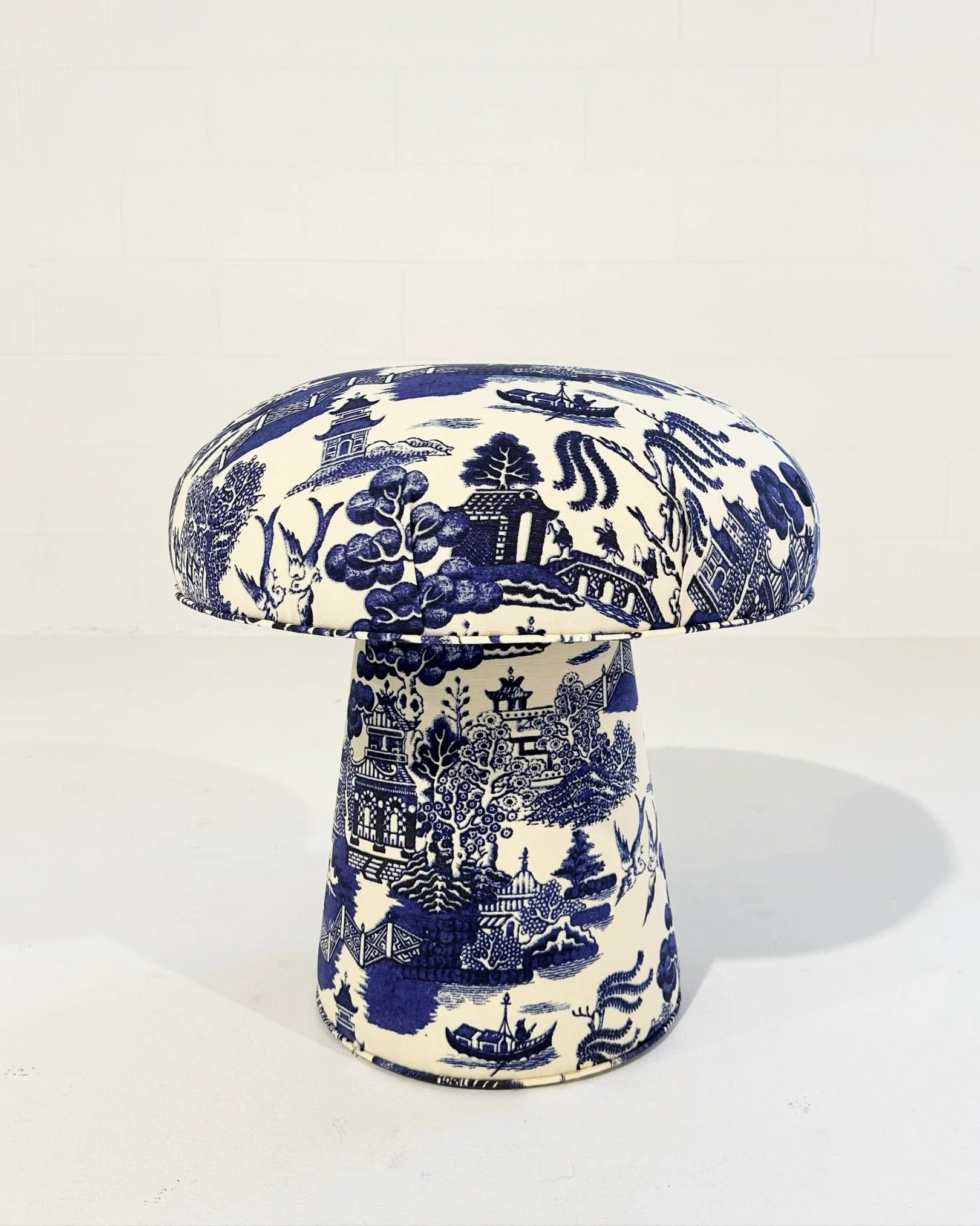 The Forsyth Mushroom Pouf in Beata Heuman Willow Linen Cotton adds a whimsical accent to your space, inspired by blue and white painted mushrooms and perfect as a unique handmade ottoman.