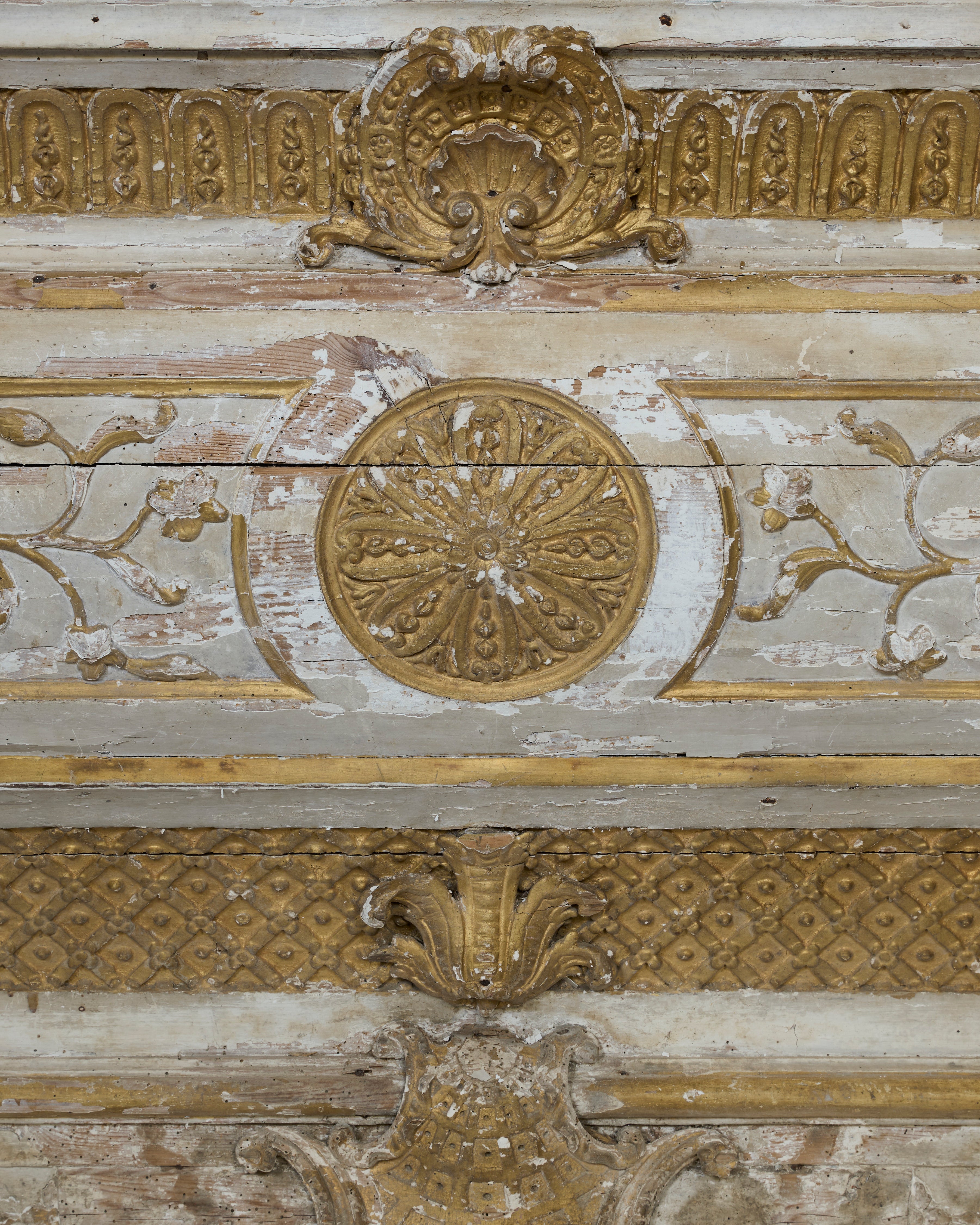 The surface retains its original historic finish, exhibiting areas of wear, paint loss, and patina consistent with age and long-term use. These surface characteristics contribute to the console’s authenticity and enhance its sculptural depth. Gilded accents remain visible throughout, offering elegant contrast against the softly aged ground.