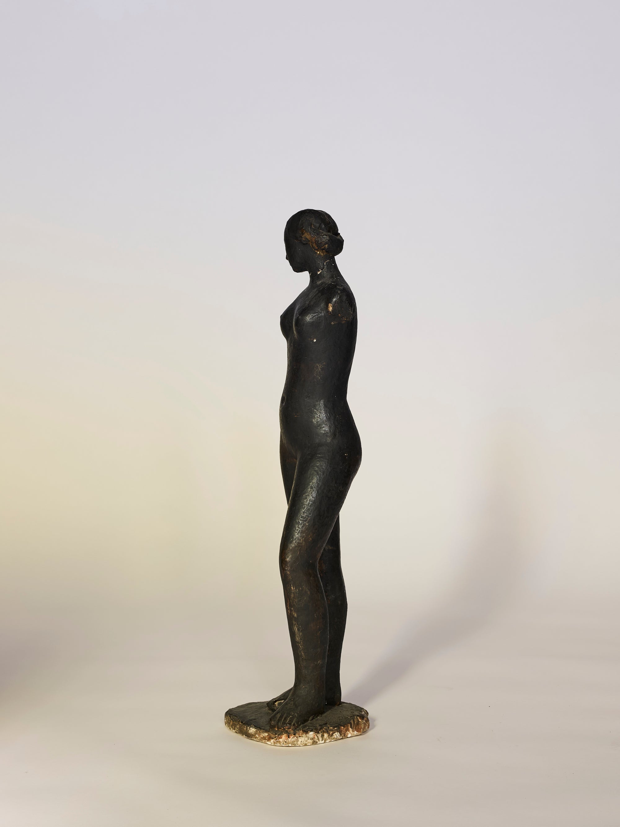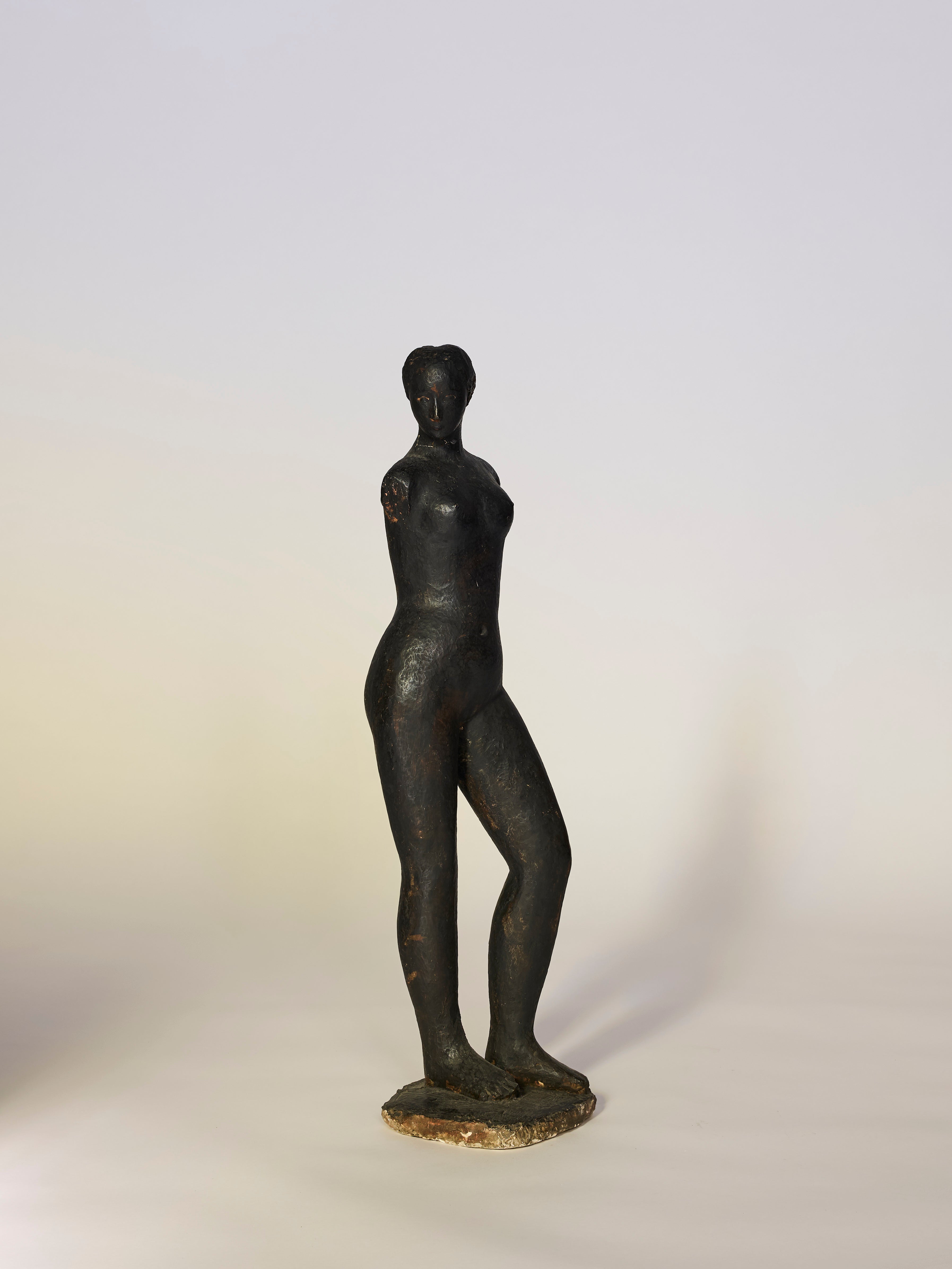 This vintage modernist nude sculpture presents a refined exploration of the human form, defined by quiet strength, balance, and sculptural restraint. The elongated figure is rendered with subtle abstraction, favoring fluid lines and a poised, introspective stance that emphasizes form over detail.
